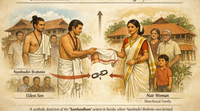 Sambandham was the traditional marriage practice observed among Nambudiris, Nairs, Samanthans, and Ambalavasis in Kerala — both within their own communities and with each other. The word derives from the Sanskrit roots meaning “equal” and “alliance.”
