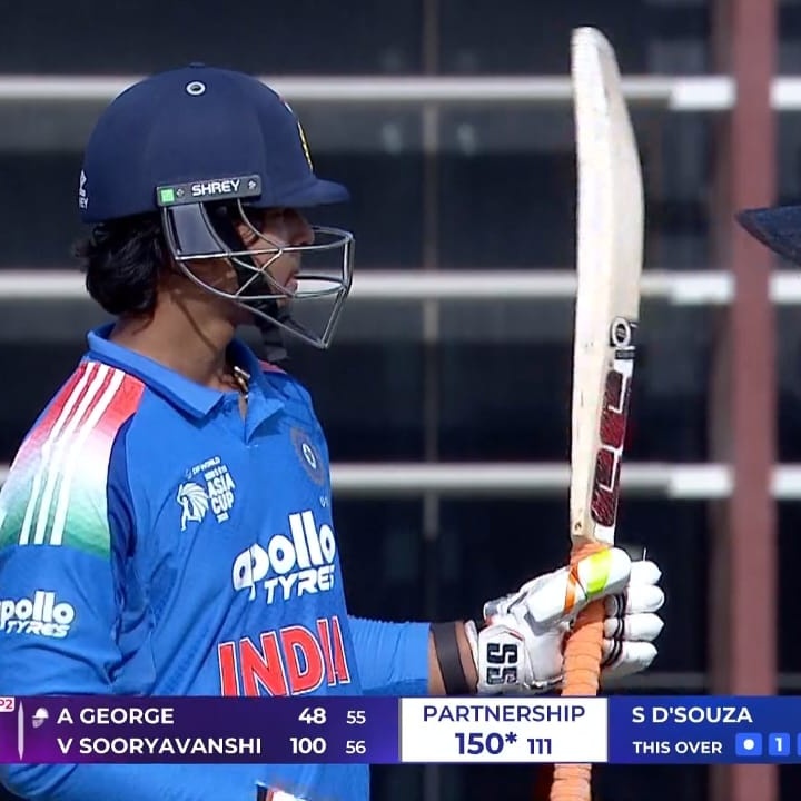 An early jolt came when skipper Ayush Mhatre, the Mumbai opener and Chennai Super Kings prospect, fell for a duck off 11 balls to pacer Yug Sharma, bringing Suryavanshi and George together for a partnership that swelled to over 150 runs. Suryavanshi, who had already notched a 52-ball ton against England earlier this year – the fastest in Youth ODI history – shifted gears post his half-century (off 30 balls), treating the UAE attack to a clinic in power-hitting. His 150 arrived in 84 balls, but a unfortunate run-out in the 37th over cut short what could have been a double-ton, falling just six runs shy of Ambati Rayudu’s Indian record of 177* from 2002.